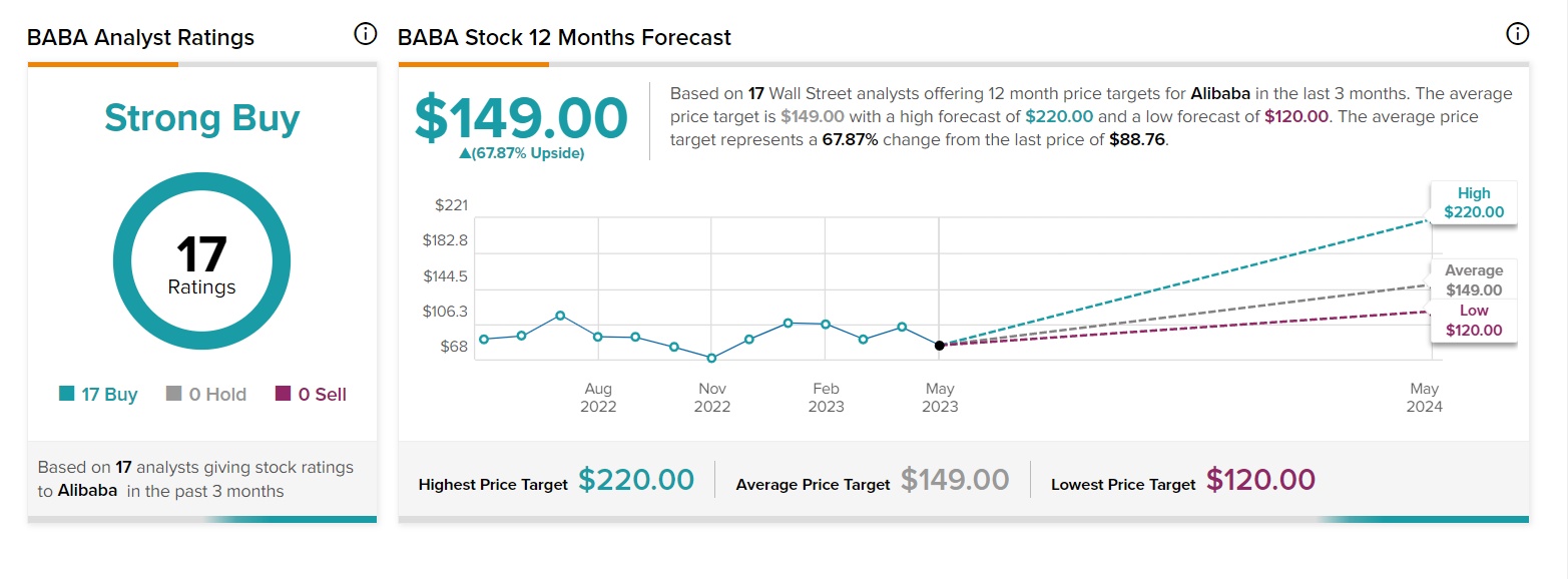 美股市场方面,基于17位华尔街明星分析师在过去3个月为阿里巴巴给予的12个月期价格目标,阿里平均目标价格为149.0美元,最高预测价格则为220.0美元,最低预测为120.0美元。17位华尔街分析师给出的评级皆为“买入”。阿里的平均目标价比周二美股收盘价格88.76美元高出67.87%。