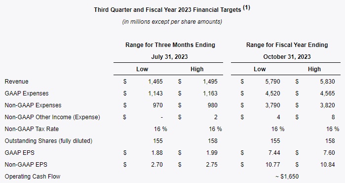 展望未来,该公司预计2023财年第三季度营收为14.65-14.95亿美元,GAAP下每股收益为1.88-1.99美元,Non-GAAP下每股收益为2.70-2.75美元;上调2023财年全年业绩指引,预计营收为57.90-58.30亿美元,GAAP下每股收益为7.44-7.60美元,Non-GAAP下每股收益为10.77-10.84美元。