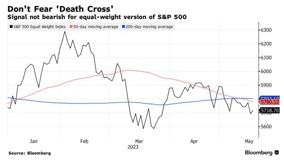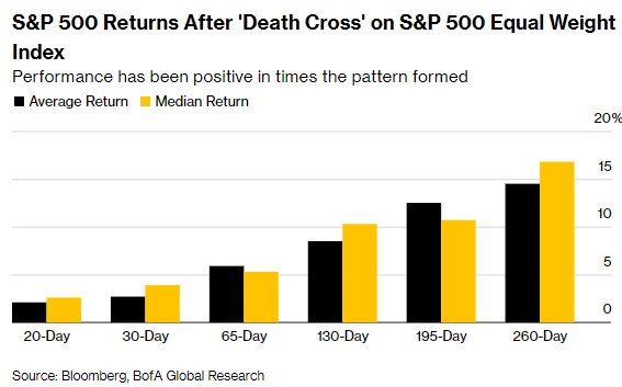 上周,标准普尔500等权指数的50天移动平均线跌破了200天移动平均线。标准普尔500等权指数是一种给予每个成分股同等份额的基准指数。这种模式被称为死亡交叉,通常表明市场正在跌破关键支撑位,可能还会进一步下跌。