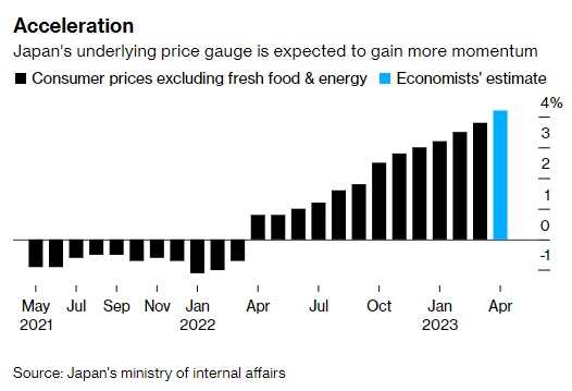 东京4月份的通胀数据已经超出预期,表明许多企业可能在本财年开始时就提高了价格。不包括新鲜食品和能源的东京CPI上涨3.8%,为1982年以来的最大涨幅。