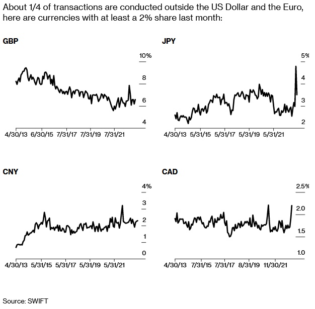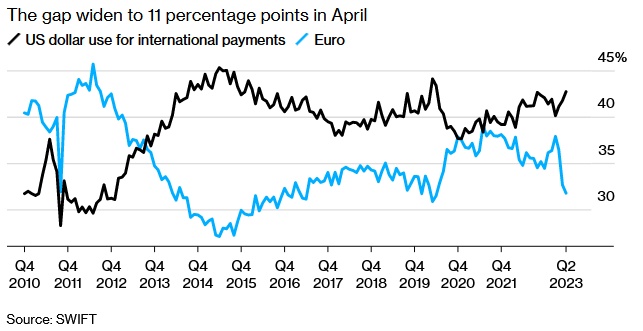 在几家美国银行倒闭以及对瑞信(CS.US)因市场的担忧情绪导致其最终被瑞银(UBS.US)收购之后,美元在跨境交易中的结算份额继续扩大。尽管欧元的结算份额有所下降,但欧元的结算份额仍排名第二。此外,日元在跨境支付中的结算份额在3月达到4.78%的峰值后出现了下滑,跌至4月的3.51%。