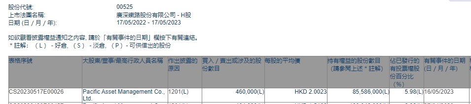 Co.,Ltd减持广深铁路股份(00525)46万股,每股作价2.0023港元,总金额约为92.11万港元。减持后最新持股数目约为8558.6万股,最新持股比例为5.98%。