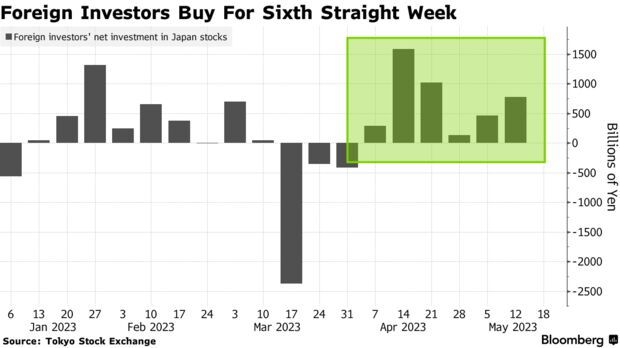 智通财经APP获悉,外国投资者连续第六周成为日本股票的净买家。根据交易所的数据,在截至5月12日的一周内,海外投资者净买入了价值7810亿日元(约合57亿美元)的股票和期货。在海外资金流入的帮助下,日本东证指数已攀升至33年来的最高水平,表现优于美国和欧洲基准股指。