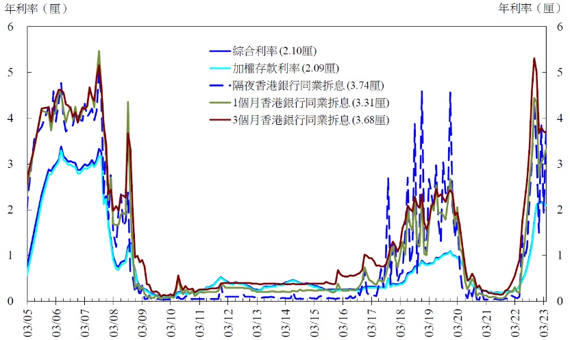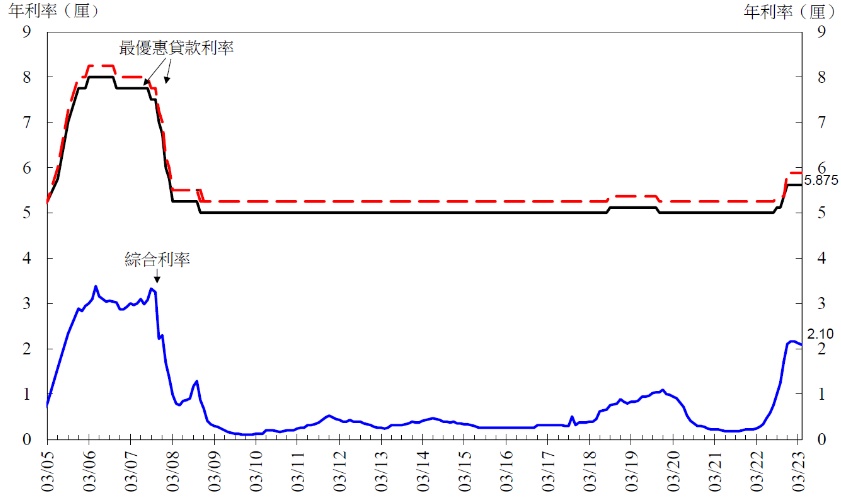 智通财经APP获悉,5月18日,香港金管局公布2023年4月底综合利率。反映银行平均资金成本的综合利率在2023年4月底为2.10厘,较2023年3月底的2.13厘下跌3基点。综合利率下跌,主要反映月内存款的加权资金成本减少。