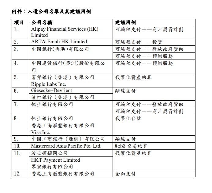 智通财经APP获悉,5月18日,香港金管局宣布启动“数码港元”先导计划。16间来自金融、支付和科技界的入选公司将于今年内进行首轮试验,深入研究“数码港元”在六个范畴的潜在用例,包括全面支付、可编程支付、离线支付、代币化存款、第三代互联网(Web3)交易结算和代币化资产结算。获选的包括:Ripple及富邦房地产代币化方案、香港电讯(06823)的担保贷款应用方案、建行(亚洲)、汇丰(00005)、渣打香港、工行(亚洲)、中行香港等。
