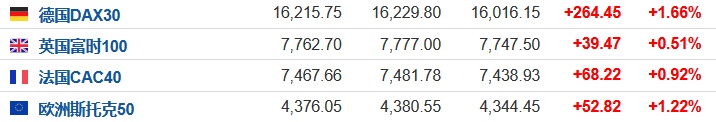 2.截至发稿,德国DAX指数涨1.66%,英国富时100指数涨0.51%,法国CAC40指数涨0.92%,欧洲斯托克50指数涨1.22%。