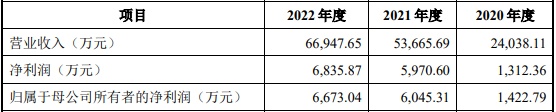 财务方面,公司2020年、2021年、2022年实现营业收入分别约为2.40亿元、5.37亿元、6.69亿元,同期实现净利润分别约为1312.36万元、5970.60万元、6835.87万元。