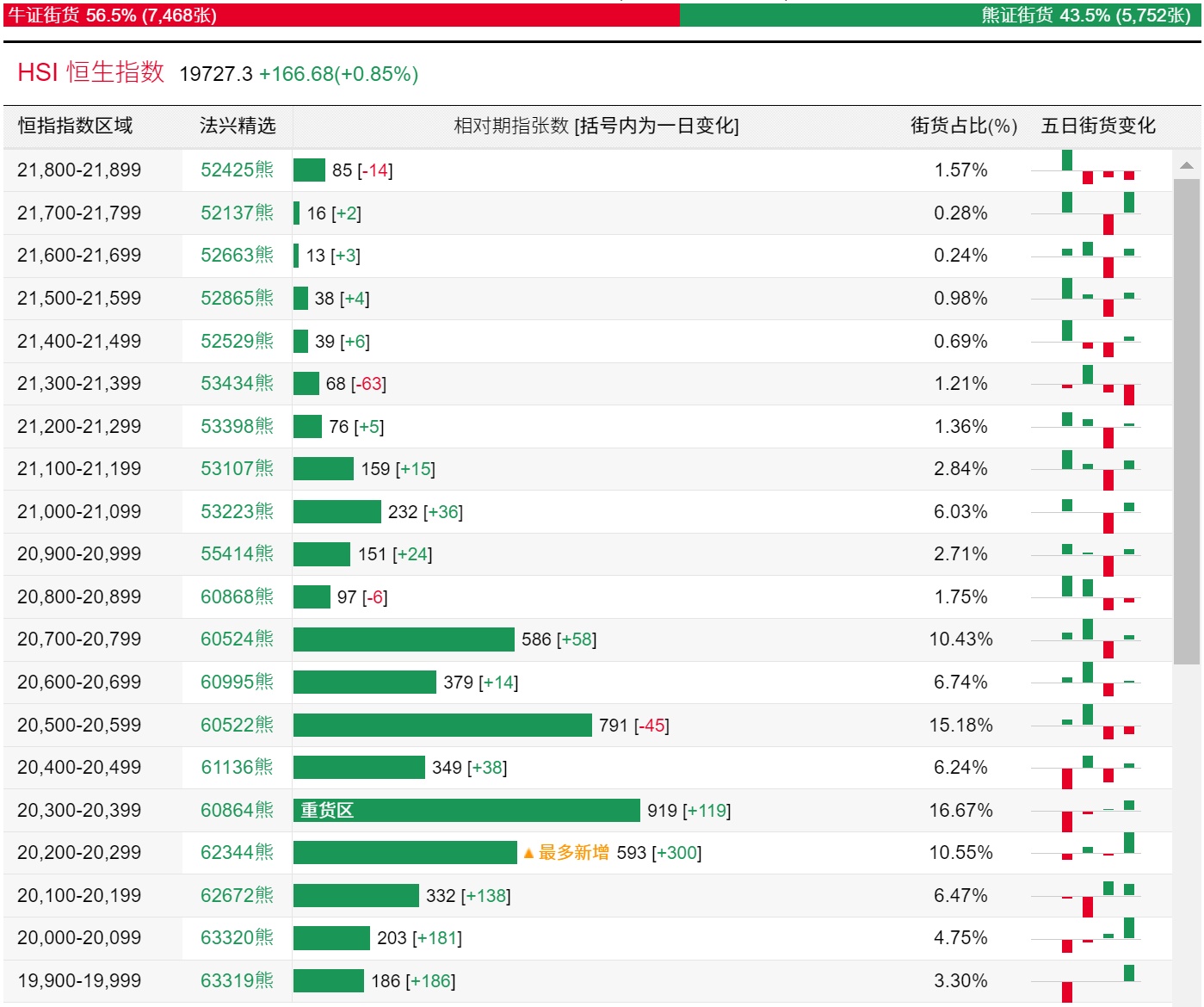 法兴恒指牛熊证街货分布图中的数据显示,熊证街货重货区在20300-20399区间,该区间最新熊证数量为919张,较上一交易日增加119张;最多新增在20200-20299区间,该区间最新熊证数量为593张,较上一交易日增加300张。