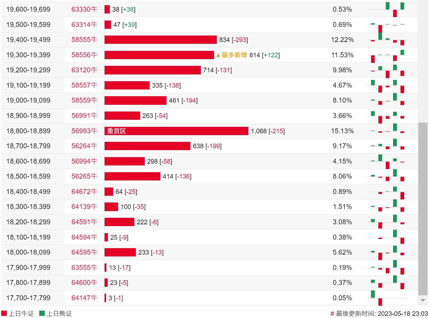 牛证街货重货区在18800-18899区间,该区间最新牛证数量为1068张,较上一交易日减少215张;最多新增在19300-19399区间,该区间最新牛证数量为814张,较上一交易日增加122张。