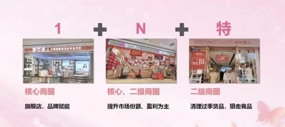 此前都市丽人沉淀多年经营经验,提出了“1+N+特”渠道布局策略,“1”则代表在核心商圈开设旗舰店,实现品牌赋能;“N”为在核心、二级商圈逐渐提升市场份额;“特”即在乡镇县城等地开特卖场,清理过季货品。以此实现根据不同区域进行门店设置,满足多元化的消费需求,以提升盈利效率的目标。
