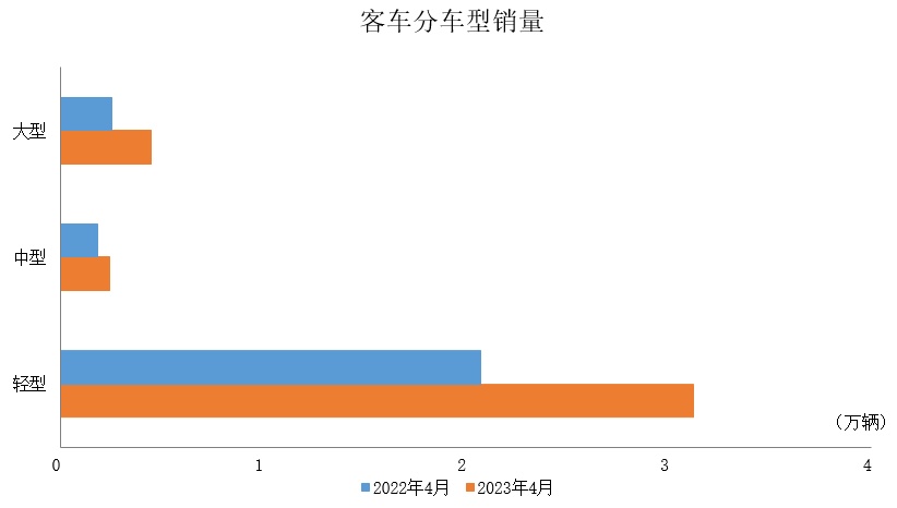 2023年1-4月,客车产销同比均呈较快增长。在客车主要品种中,与上年同期相比,大型客车和轻型客车产销均呈两位数增长,中型客车产销呈明显下降。