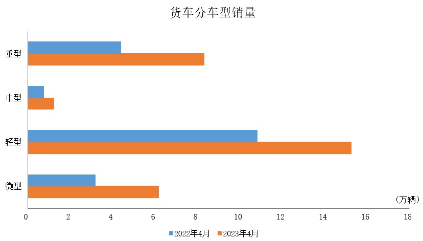 2023年4月,货车产销环比均呈明显下降,同比均呈快速增长。在货车细分品种中,与上月相比,中型货车和微型货车产销呈不同程度增长,重型货车和轻型货车产销明显下降;与上年同期相比,四大类货车品种产销均呈不同程度增长。