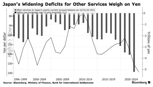 策略师Lhamsuren Sharavdemberel和Shinichiro Kadota周四在报告中写道,日本所谓的“数字赤字”(源自向奈飞(NFLX.US)和亚马逊(AMZN.US)等海外科技公司的支付)相对于该国经常账户余额中的贸易和旅行而言已经变得很大,其持续扩张将给日元带来压力。他们表示,这一赤字去年达到了4.8万亿日元(合347亿美元),几乎占日本服务账户赤字的90%。