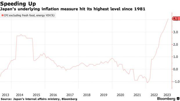 日本内务部周五公布的数据显示,受加工食品和酒店价格上涨推动,不包括生鲜食品在内的消费者价格同比上涨3.4%;剔除能源和生鲜食品的消费者价格(衡量通胀趋势加深程度的指标)同比上涨4.1%,创下1981年以来的最高水平。