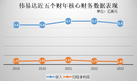 拉长时间线来看,伟易达的股价颓势归根结底或许还是基本面增长停滞所致。回溯历史,2019财年-2023财年,伟易达的收入分别为21.62亿美元、21.66亿美元、23.72亿美元、23.71亿美元、22.42亿美元,归母净利润分别为1.71亿美元、1.91亿美元、2.31亿美元、1.73亿美元、1.49亿美元。核心财务数据均处在连续负增长的通道之中。