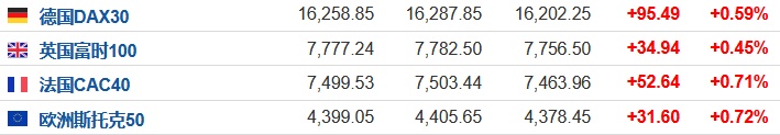 2.截至发稿,德国DAX指数涨0.59%,英国富时100指数涨0.45%,法国CAC40指数涨0.71%,欧洲斯托克50指数涨0.72%。