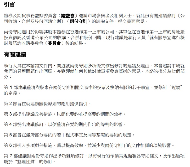 智通财经APP获悉,5月19日,香港证监会就《公司收购、合并及股份回购守则》(简称两份守则)的建议修订展开咨询。建议修订包括将收购执行人员的现行惯常做法编纂为守则条文,厘清两份守则及其他修订。咨询文件亦引入多项措施,以减少与两份守则下刊发文件相关的环境影响。香港证监会欢迎相关人士于2023年6月23日或之前向其提交意见书。