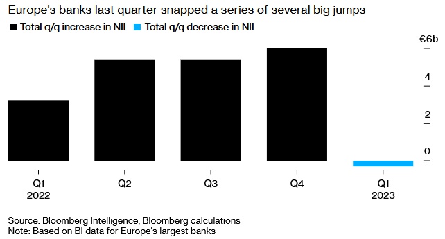 智通财经APP获悉,随着欧洲银行开始向储户支付更高的存款利率、以及基准利率逐渐接近峰值,银行们的净利息收入增长开始放缓。今年第一季度,欧洲各大银行的净利息收入环比下降,结束了去年连续四个季度环比上升的趋势。