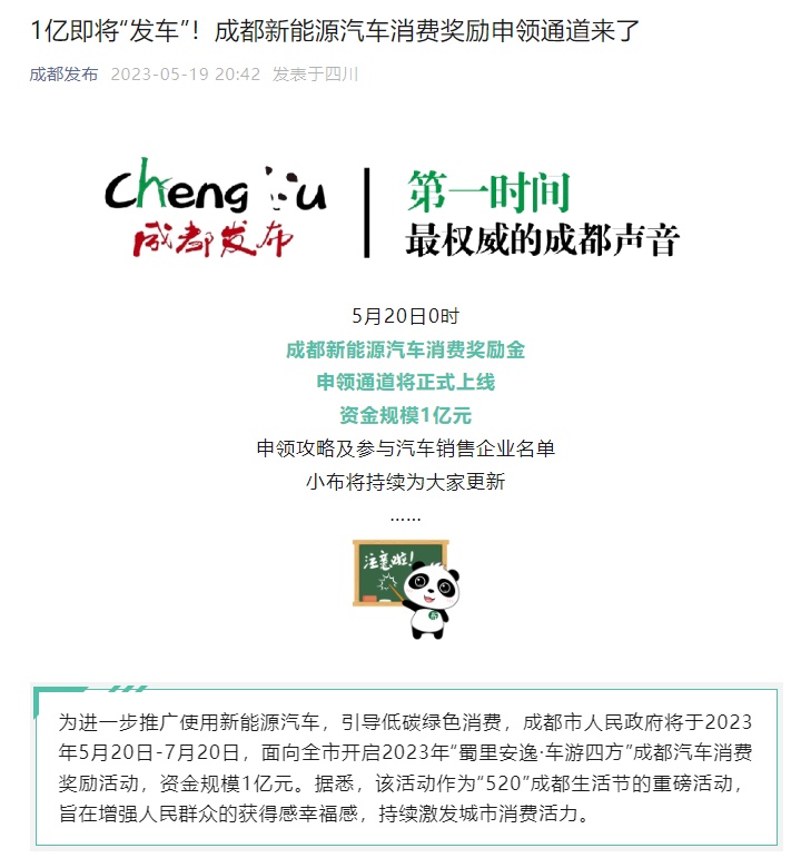 智通财经APP获悉,5月19日,据微信公众号“成都发布”,成都市政府将于5月20日-7月20日,面向全市开启2023年“蜀里安逸·车游四方”成都汽车消费奖励活动,资金规模1亿元。个人消费者在参与活动的汽车销售企业购买新能源家用乘用新车(以新车上牌为新能源汽车专用绿色车牌为准),成都市给予个人消费者以8000元/人汽车消费奖励,共有12500个名额。