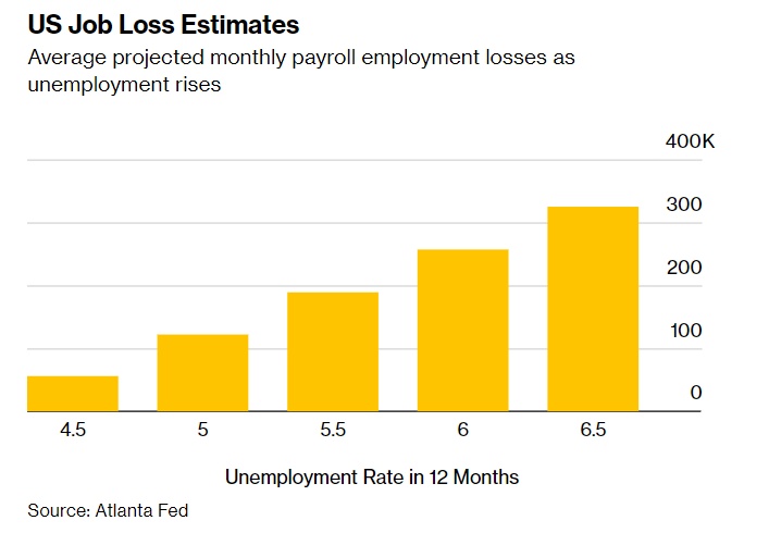 许多经济学家目前认为,美国经济将“温和”衰退,但即使是这种情况,至少也会导致数十万美国人失业。根据亚特兰大联储模型的基线假设,一年内失业率达到4.2%或更高,将意味着美国月度净就业人数已变为负值。