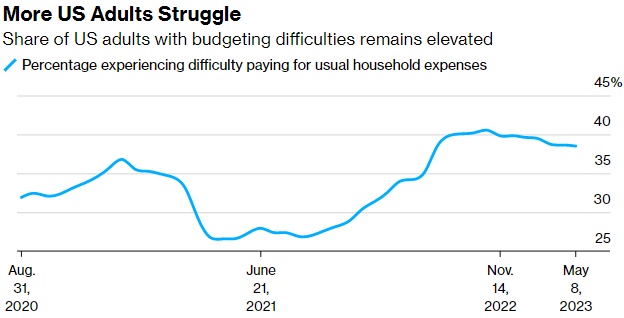 与此同时,美国人口普查局的一项调查显示,与疫情刚结束时相比,现在有更多的美国人难以支付开支。据美国人口普查局“家庭脉搏”调查最新数据,截至5月8日的一周内,有大约38.5%(8910万)的美国成年人在支付家庭开支时遇到困难,这一数字较去年同期的34.4%和前年同期的26.7%均有所增加。