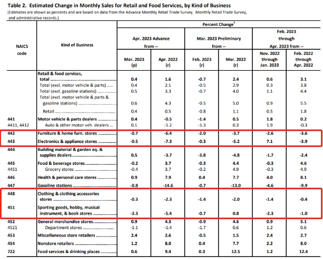 更细致地看,在零售数据分项的13个大类中,非必需品销售额下降势头明显,运动商品、兴趣、乐器和书店的销售额环比大跌3.3%,是所有分项中跌幅最大的。家装、电子产品、服饰销售额也在走低。