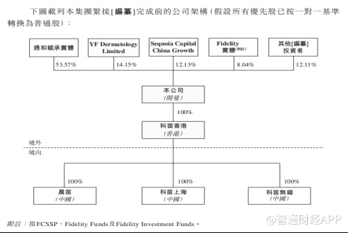 值得注意的是,除了通和毓承之外,云峰基金通过YF Dermatology Limited间接持股科笛集团14.15%股权,红杉资本、富达投资、其他投资者直接或间接持股比例分别为12.13%、8.04%和12.11%。
