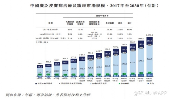 智通财经APP了解到,广泛皮肤病治疗及护理市场具有良好的发展前景。弗若斯特沙利文报告显示,2021年中国的广泛皮肤病治疗及护理市场已经达到4,718亿元(人民币,下同)规模,已经至2030年市场规模将突破万亿大关,达到10,390亿元,2025年至2030年的复合年增长率为9.2%。