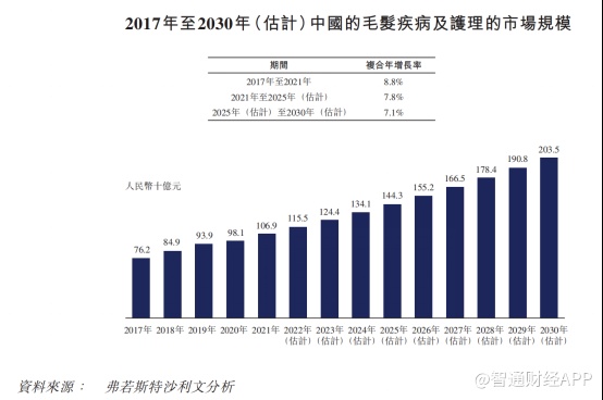 在细分市场上,科笛集团具备优势的领域同样具有良好成长潜力。以毛发疾病及护理市场为例,2021年中国脱发患病人数达到2.52亿人,其中53.8%为雄激素性脱发。中国的脱发患病率预期于2030年将增长至2.58亿人。2017年至2021年,中国的毛发疾病及护理市场规模由762亿元增加至1,069亿元,预期于2025年将增长至1,443亿元,于2021年至2025年的复合年增长率为7.8%。