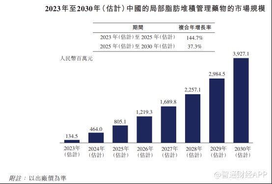 局部脂肪堆积管理药物市场规模,预计将由2023年的1.35亿元增长至2025年的8.05亿元,2023年至2025年的复合年增长率为144.7%。2030年市场规模将达到39.27亿元,2025年至2030年的复合年增长率为37.3%。