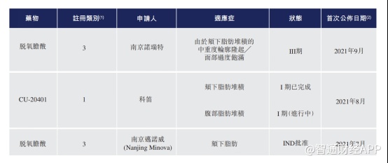 局部脂肪堆积管理药物市场规模较小,但行业竞争格局可能较为清晰。目前,中国并无获批准的局部脂肪堆积管理药物。三个候选产品在中国处于临床试验阶段,科笛集团有望取得先机。