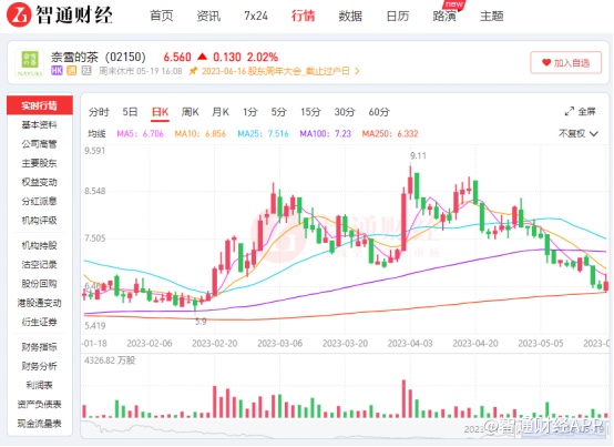 自2022年触及3.65港元的最低点后,奈雪的茶(02150)在疫情防控新二十条发布后股价迎来回升,于4月3日达到9.11港元的高点,随后扭头向下,截至5月19日已跌回6.56港元,在将近两个月时间内跌去近三成。