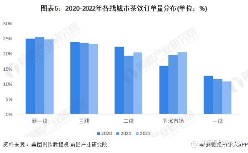 根据美团数据显示,尽管茶饮订单量仍然主要集中于新一线市场,但2020-2022年间下沉市场的订单占比已从15.9%上升至20.6%,成为唯一一个连续三年出现订单量增长的市场。