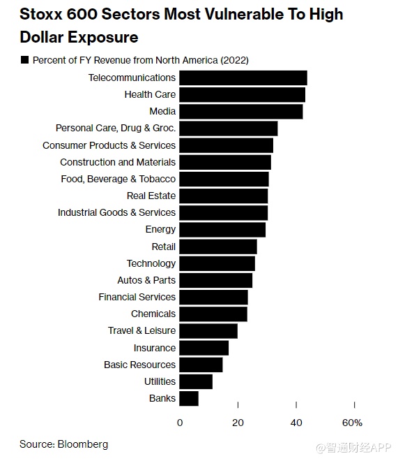 据Bloomberg的分析,欧洲的电信、医疗、媒体和主要消费品公司在北美的营收占比最大。