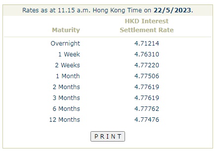 智通财经APP获悉,5月22日,香港银行公会数据显示,港元拆息近乎全线上升,两周至一年期拆息全线高企于4.77厘以上,其中,与楼按相关的一个月拆息连升5天,报4.77506厘,为去年12月16日以来最高,与同期美元LIBOR息差收窄至36基点。不过,隔夜息连升四天创逾15年新高后,今日回落至4.71214厘。