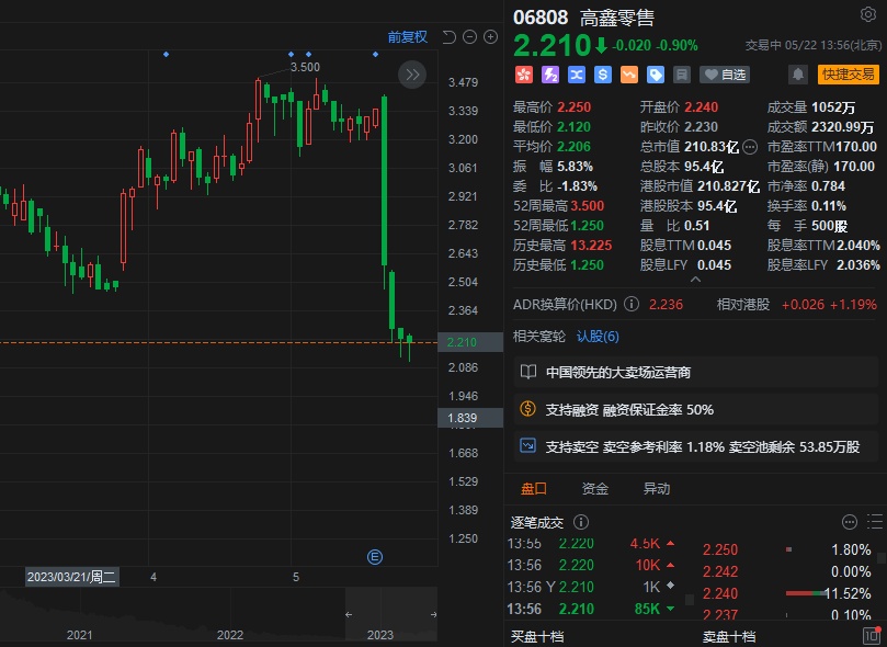 智通财经APP获悉,5月22日,大润发的母公司高鑫零售(06808)早盘一度跌超4%,自5月16日发布业绩后累计跌幅超35%。截至发稿,股价跌0.9%。5月16日,高鑫零售发布了截至3月31日的2023财年业绩报告。报告显示,该年度收入为836.62亿元人民币,同比下降了5.1%;营业利润11.77亿元,同比增长6438.9%。净利润为7800万,相较上一财年实现了扭亏为盈的转变。