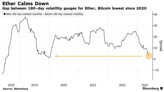 加密衍生品平台OrBit Markets的联合创始人Caroline Mauron表示:“较低的波动性通常有助于机构投资者将更多资金配置到加密货币中,因为购买保护和管理风险敞口变得更便宜。”“波动性差的压缩可能会促使长期投资者更多地投资以太坊。”