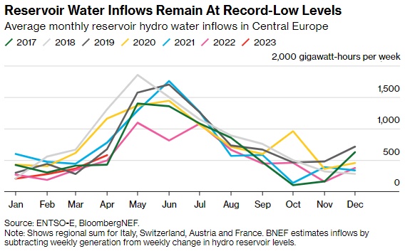 尽管如此,去年的干旱——使整个欧洲大陆的河流干涸——仍然是一个鲜活的记忆。意大利、瑞士、奥地利和法国的水库正在以2017年以来的第二低速度填满。这可能导致更多的天然气被用于发电,从而推高电价。