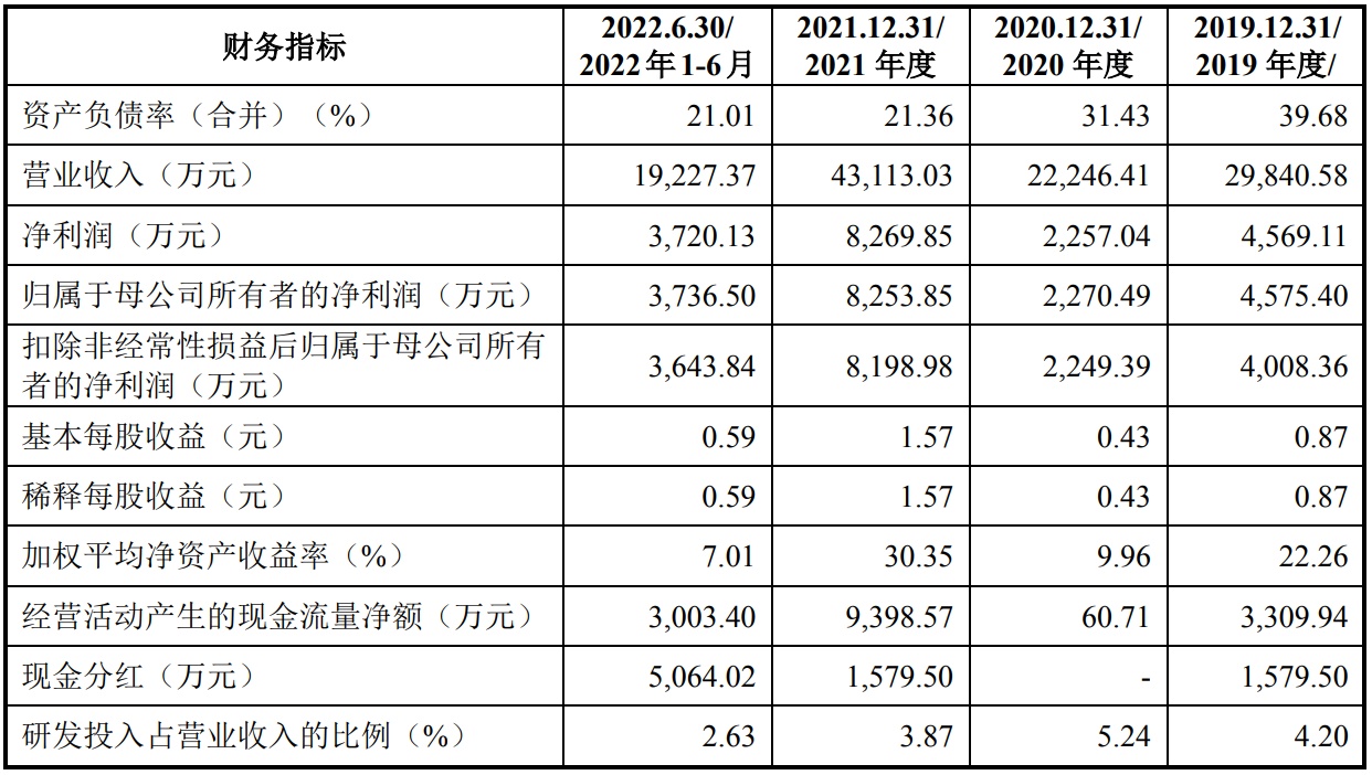 财务方面,2019年、2020年、2021年和2022年1-6月,恒业微晶实现营业收入分别约为2.98亿元、2.22亿元、4.31亿元和1.92亿元;同期,实现净利润分别约为4569.11万元、2257.04万元、8269.85万元和3720.13万元。