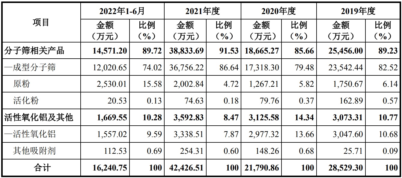 据招股书,恒业微晶主要从事分子筛相关产品的研发、生产、销售和技术服务,主要产品包括分子筛原粉、分子筛活化粉及成型分子筛。