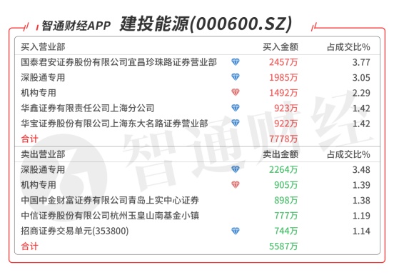 建投能源(000600.SZ):多主力现身龙虎榜,机构席位对倒买入667万元,深股通对倒卖出279万元,买一是知名游资的席位买入2456万元,买五是知名游资的席位买入901万元,当日净买入3385万元,该股突破近期高点,则打开上升空间。