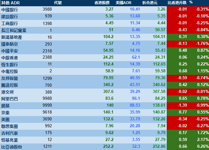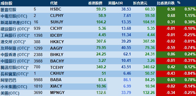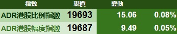 智通财经APP获悉,周一,美股三大指数涨跌不一,港股ADR指数上涨,按比例计算,收报19693点,较香港收市涨15.06点或0.08%。