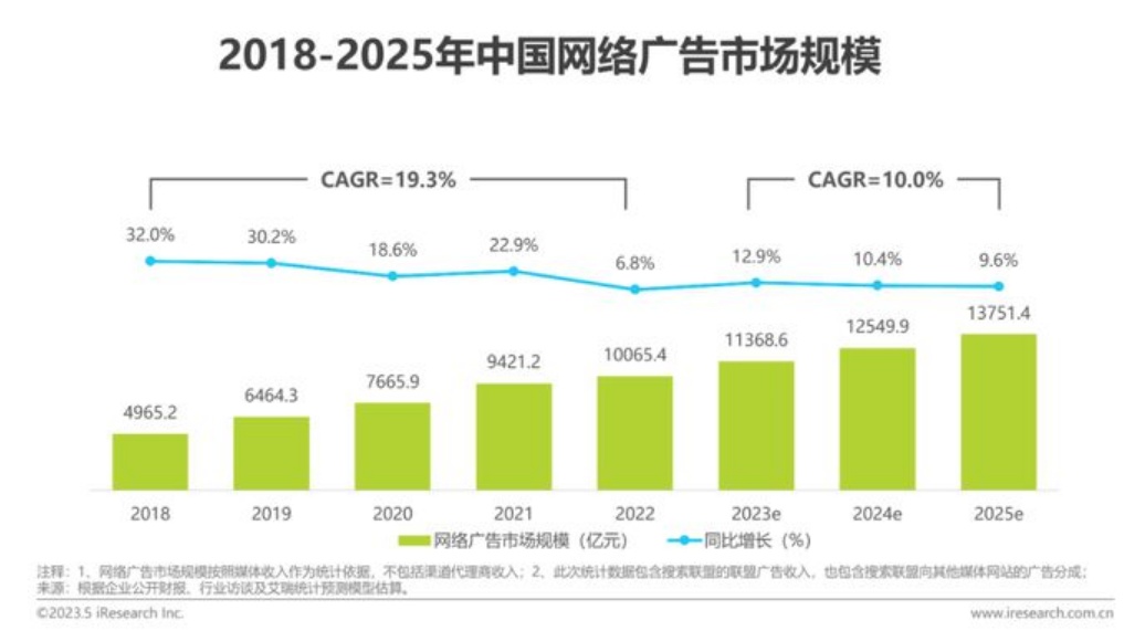 一分为二地看,如前文所述,自2023年Q1起,短视频营销行业开启渐进式复苏旅程已成为确定性的事。据艾瑞咨询披露,随着中国资本市场对双向开放的持续强化,以及人工智能等新兴技术的迅速发展,品牌营销获得了新鲜的发展土壤,因此中国网络广告市场或将出现回暖,2023年规模预计可达11368.6亿元,同比增长率或将提升至12.9%。