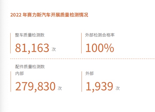 与此同时,赛力斯持续夯实“研发、制造、质量、服务及供应链”五大板块,打造从产品规划到售后服务全生命周期的质量保障体系,全面提高产品质量管理水平。2022年,赛力斯在质量管控体系上实现了再升级,外部检测合格率100%。