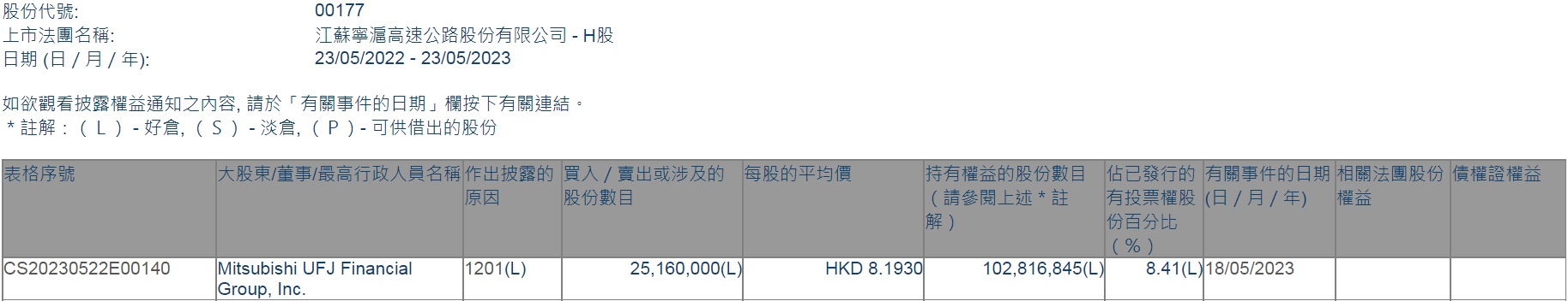 智通财经APP获悉,香港联交所最新资料显示,5月18日,Mitsubishi UFJ Financial Group, Inc.减持江苏宁沪高速公路(00177)2516万股,每股作价8.193港元,总金额约为2.06亿港元。减持后最新持股数目约为1.03亿股,最新持股比例为8.41%。