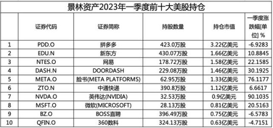 持仓数据显示,截至一季度末,景林资产持仓总价值为17.28亿美元,相比上一季度有所增加,中概股依然占据主要之地。景林资产F13文件显示,阿里巴巴、网易、拼多多、360数码科技、中通快递、爱奇艺、陌陌科技、新东方教育、万物新生(爱回收)、Boss直聘等均在景林资产的持仓中,其中,景林资产前十大重仓股中有5只为中概股,分别是拼多多、新东方、网易、中通快递和BOSS直聘,仓位变动幅度分别为-24%、601%、3%、26%和-9%。中通快递的持股价值达1.12亿美元,位列第六。