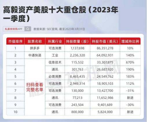 同时,高毅资产方面,截至一季度末,其共持有14只美股标的,合计持仓市值3.02亿美元。高毅资产前十大重仓股中有8只为中概股,拼多多、中通快递、网易、雾芯科技、好未来和新东方的增持比例分别为10%、140%、190%、183%、112%。拼多多和中通快递成为高毅资产前两大美股重仓股,持仓市值分别为8635万美元和6409万美元,二者合计占到高毅资产近半仓位。
