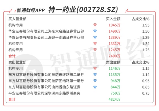 特一药业(002728.SZ):多主力现身龙虎榜,4家机构席位对倒买入3940万元,买二是知名游资的席位买入1490万元,买三是顶级游资炒股养家的席位买入1328万元,当日净买入5470万元,该股今日放量突破所有均线,预计有溢价。