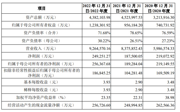 财务方面,公司2020年、2021年、2022年实现营业收入分别约为598.66亿元、837.59亿元、926.46亿元,同期实现净利润分别约为21.91亿元、18.75亿元、24.93亿元。