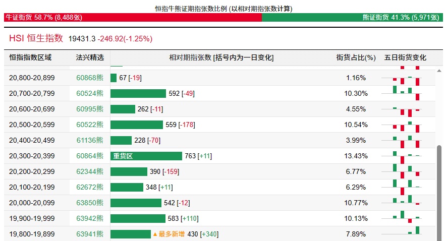 法兴恒指牛熊证街货分布图中的数据显示,熊证街货重货区在20300-20399区间,该区间最新熊证数量为763张,较上一交易日增加11张;多新增都在19800-19899区间,该区间最新熊证数量为430张,较上一交易日增加340张。